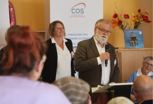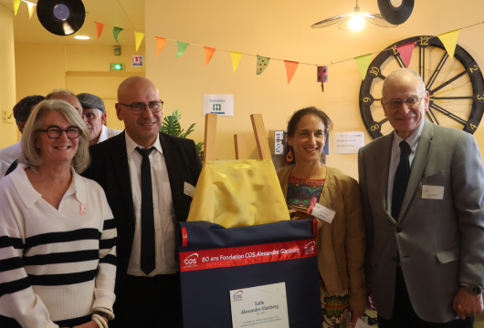 À partir de 14h30, résidents, familles, partenaires, bénévoles, professionnels et élus locaux étaient réunis dans la salle de restauration inaugurée à cette occasion. Discours officiels et témoignages ont rythmé le début d’après-midi avant le symbolique dévoilement de la plaque « Salle Alexandre Glasberg ». Sous la forme d’un jeu de questions / réponses, 2 professionnelles et 4 résidents ont pu témoigner sur leur parcours et leur vie au sein de l’établissement. Un moment fort qui a permis de se rendre compte de l’esprit convivial et chaleureux au sein de la résidence COS Sainte-Marthe. Le Dr. BARRET, médecin coordonnateur depuis une vingtaine d’années au sein de l’établissement a également pris la parole avant son départ à la retraite à la fin de l’année.