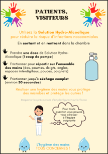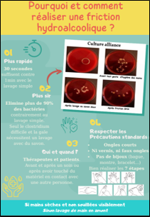 Il s’agissait de promouvoir la friction hydroalcoolique avec la possibilité d’ajouter les prérequis à l’hygiène des mains et une comparaison avec le lavage des mains eau + savon, ces affiches étant destinées aux professionnels et aux patients.