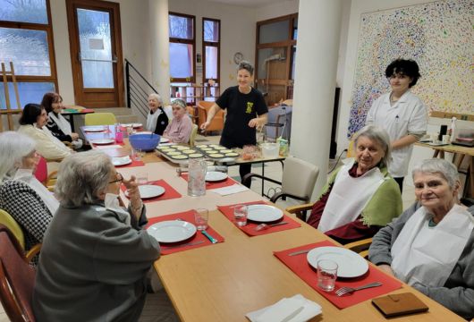 Comme toujours, chacune a mis la main à la pâte : mélanger, verser, étaler… Ces gestes du quotidien permettent de maintenir les capacités praxiques et gnosiques tout en valorisant l’estime de soi.