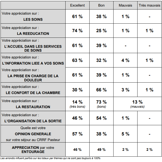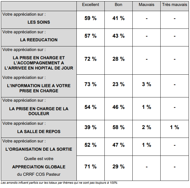 Le CRRF COS Pasteur distribue un questionnaire de satisfaction à la sortie des patients en hospitalisation complète. Les résultats :