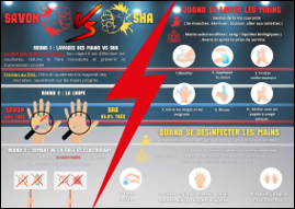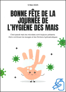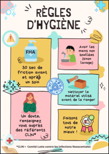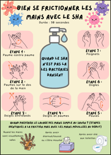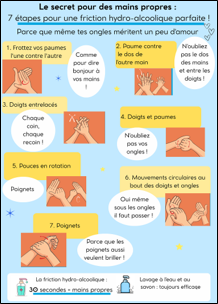 Il s’agissait de promouvoir la friction hydroalcoolique avec la possibilité d’ajouter les prérequis à l’hygiène des mains et une comparaison avec le lavage des mains eau + savon, ces affiches étant destinées aux professionnels et aux patients.